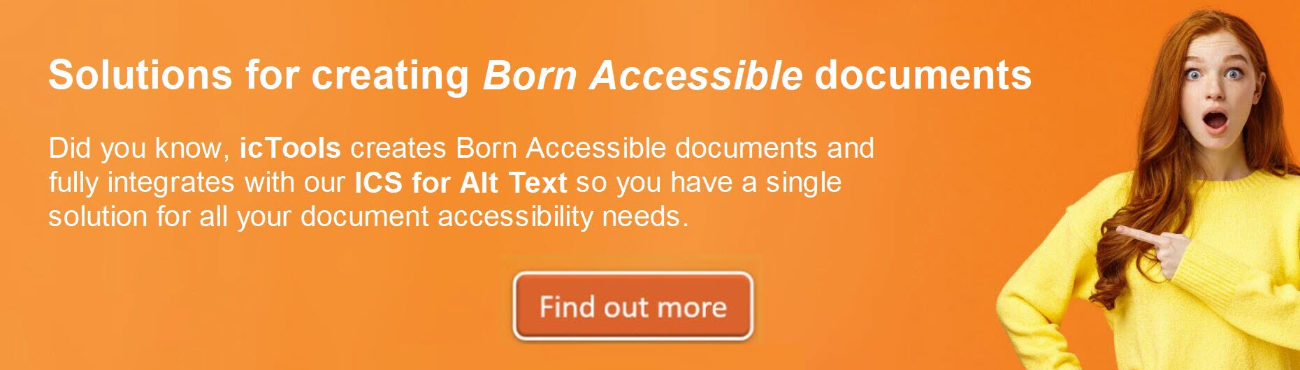 When combined with icTools' robust automation and accessibility features, the documents created with Microsoft Word are born accessible, making them accessible to all users, including those with disabilities. icTools works in both Microsoft Word desktop and Office 365, offering multiple output delivery formats. Finally, content-driven organizations can efficiently create documents that are “born” compliant with global accessibility standards such as WCAG 2.0 and 2.1, PDF/UA, and ADA Section 508.